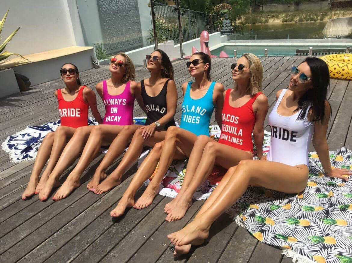 Le scritte più cool e minimal del momento sono BRIDE per la sposa e TEAM BRIDE, BRIDE SQUAD, BRIDE TRIBE, BRIDE GANG o BACHELORETTE per tutte le altre partecipanti all’addio al nubilato.